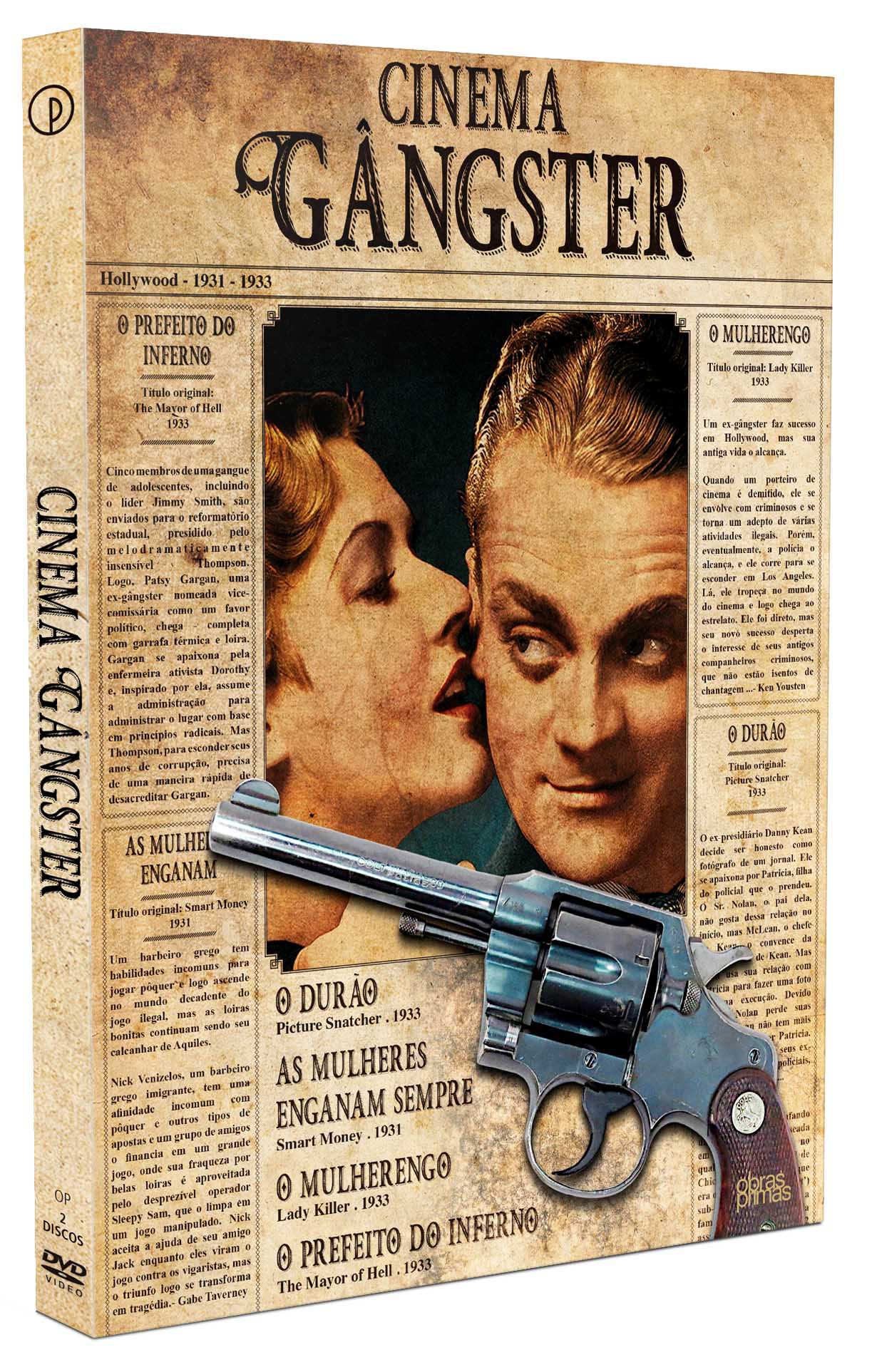 Obras-Primas do Cinema apresenta, Cinema Gângster. Digipak com 2 DVDS e 4 filmes de um dos subgêneros mais populares da Era Clássica de Hollywood. O cinema gângster é um subgênero do cinema policial, onde gangues e organizações criminosas possuem destaque. Tornou-se popular durante a década de 30, principalmente na era Pre-Code. Esse subgênero, em sua maioria, enfatiza a vida dos criminosos, mostrando-os como ricos, prósperos e rodeados de mulheres. É também responsável pela popularidade de atores como James Cagney, Edward G. Robinson, Humphrey Bogart, entre outros. Nos extras, além de cinejornais da época, um especial produzido por Rodrigo Veninno e Camila Hortêncio sobre o Cinema Gângster.